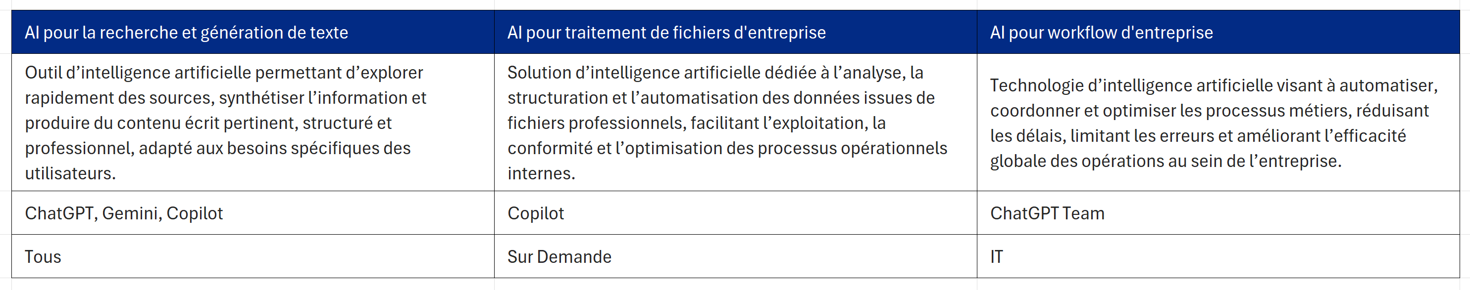 Par exemple, dans cette matrice, les outils comme ChatGPT ou Gemini peuvent être autorisés pour toute l’entreprise dans un cadre de recherche générale. En revanche, le traitement de données internes n’est autorisé que via les licences Copilot réservées aux managers et aux profils nécessitant spécifiquement cette fonctionnalité. Enfin, l’utilisation automatisée via l’API officielle de ChatGPT est strictement limitée au compte professionnel géré par l’entreprise, afin d’en garantir le contrôle complet et la conformité.