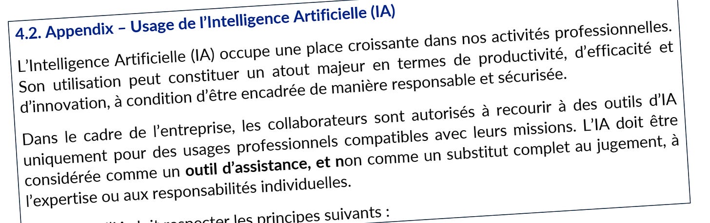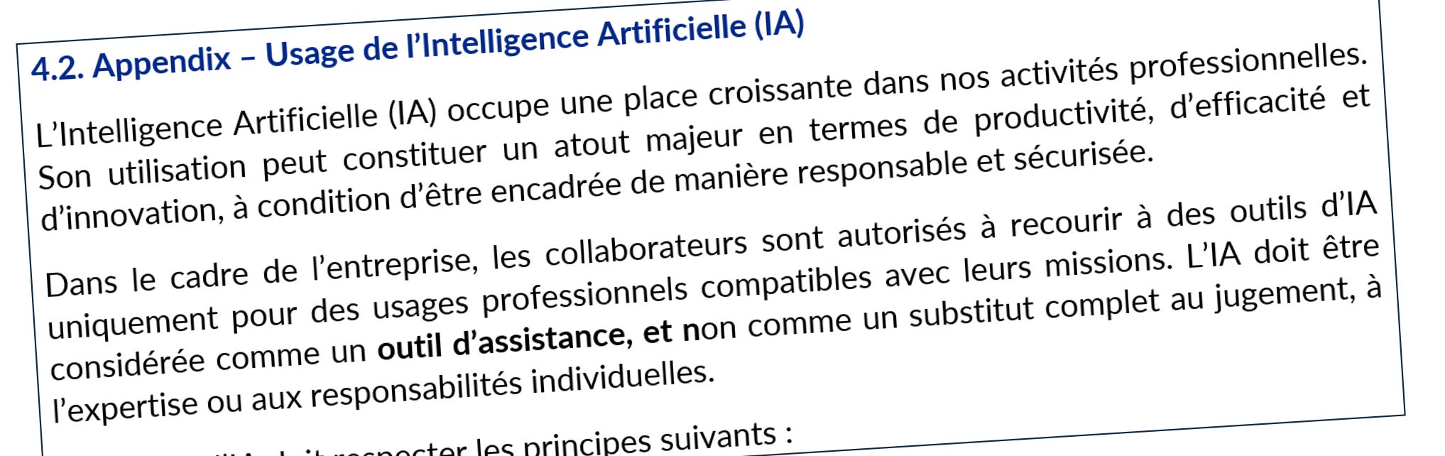 Dans notre expérience avec les DSI avec qui nous avons traité ce sujet, la solution retenue a souvent été de créer un simple appendix dédié à l’utilisation de l’IA, directement intégré à la charte informatique existante. Cet ajout permet de clarifier très rapidement les règles attendues, d’assurer une cohérence avec les autres politiques internes déjà en place, et surtout de responsabiliser explicitement les utilisateurs.