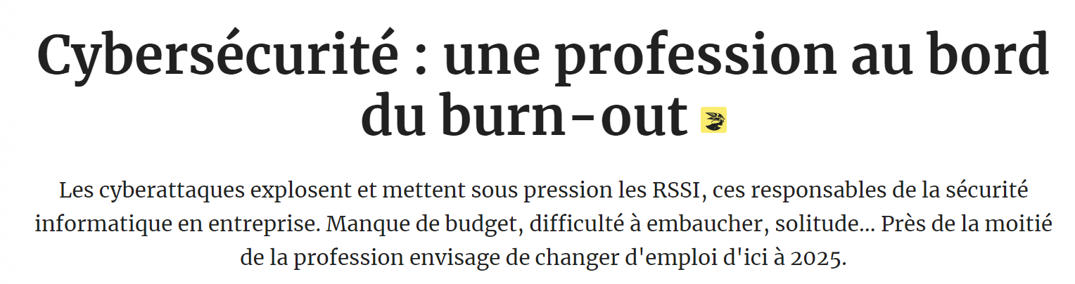 J'ai récemment été témoin de la situation d'un RSSI dynamique et engagé qui, du jour au lendemain, s'est retrouvé en arrêt de travail. Cela dure depuis plus de 6 mois, pas sûr qu’il pourra reprendre le même type de poste.