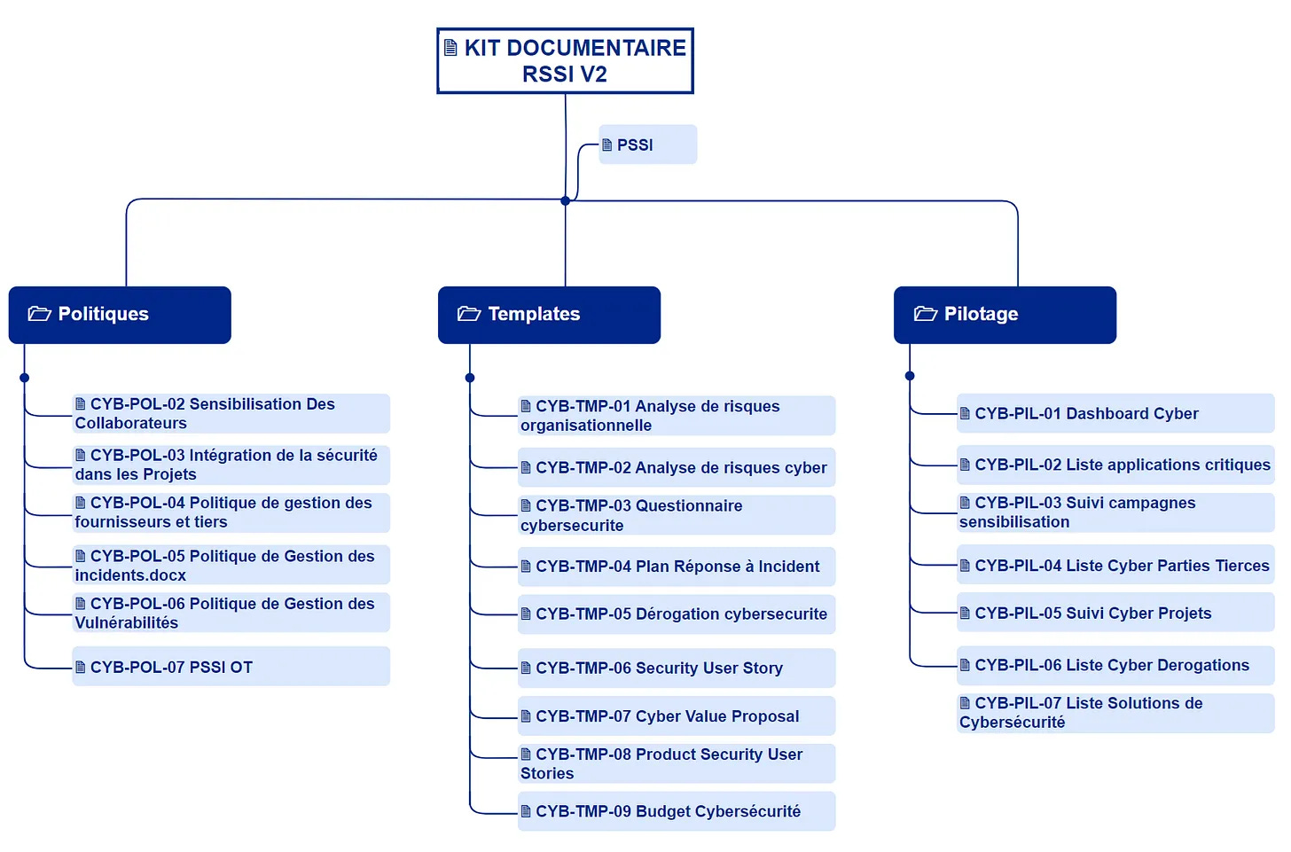 Politiques: PSSI, PCA / PCI, Politique de sensibilisation, Politique d’intégration de la sécurité dans les projets, Politique de gestion des fournisseurs & tiers, Politique de gestion des incidents, Politique de gestion des vulnérabilités
