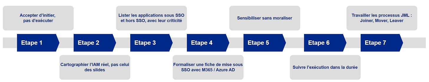 La première étape consiste à poser une règle simple : le RSSI initie et cadre, mais n’exécute pas à la place des autres. Les actions opérationnelles doivent être portées par les équipes métiers et IT concernées. Ce n’est ni une fuite ni un désengagement, c’est une condition de survie. Sans cette ligne rouge, le RSSI devient rapidement le point de blocage de toute l’organisation.Cartographier l’IAM réel, pas celui des slides